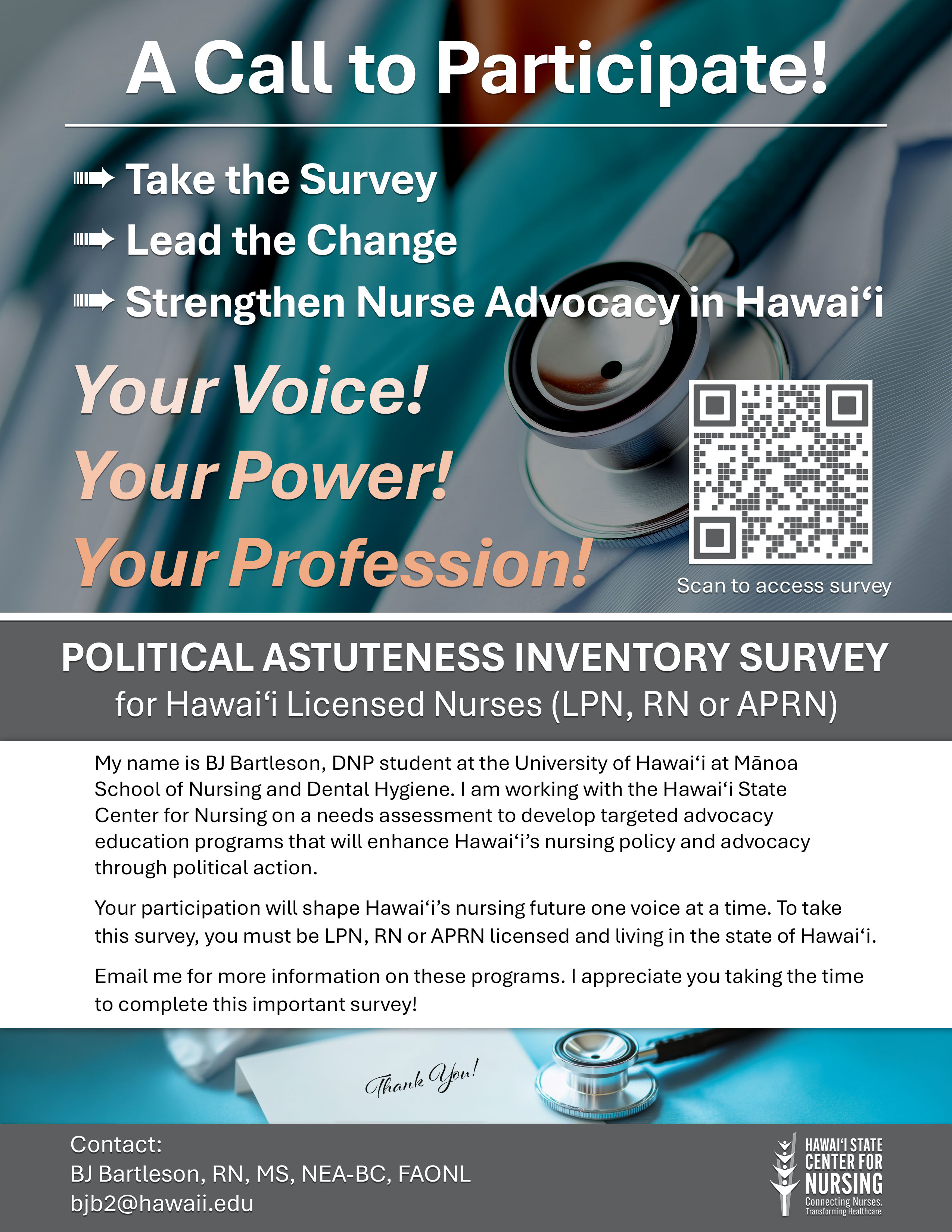 This survey is anonymous, takes only a few minutes, and will directly inform programs to strengthen nursing advocacy, leadership development, and policy influence across our state. The more nurses who participate, the stronger and more credible our findings will be for Hawaiʻi nursing and health policy leaders.